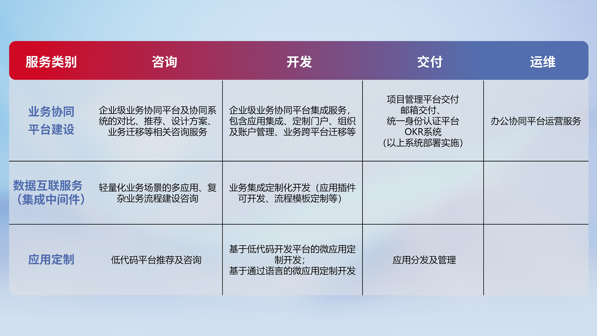 针对钉钉、、、企微、、、、IDaas等平台级产品提供产品的规划、、方案、、交付、、、定制化开发等服务,,,实现如统一协同办公、、、、智能客户服务、、混合会议管理、、、、智能数据查询、、、等业务场景,,实现数字化转型。。
